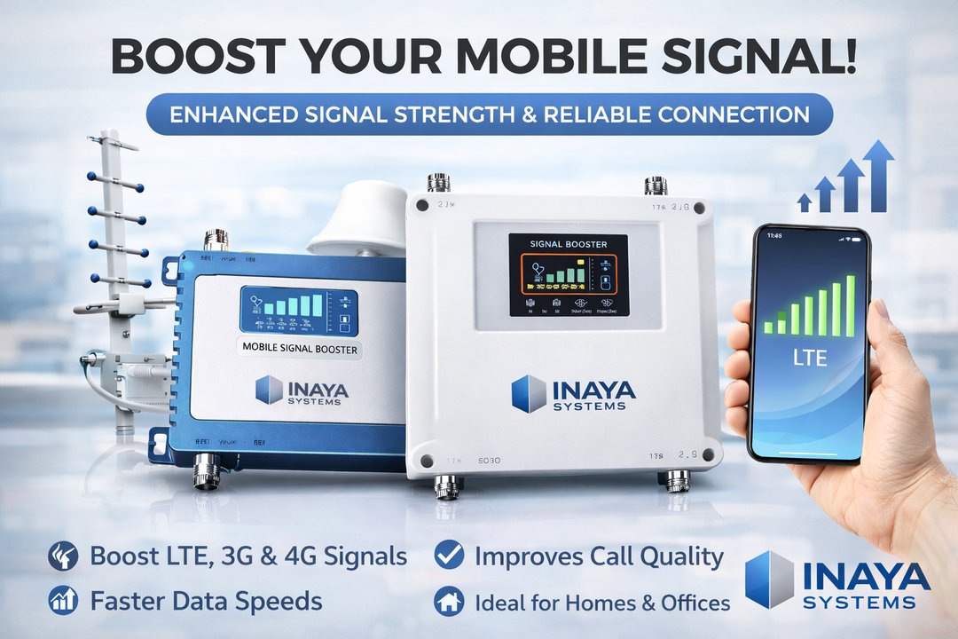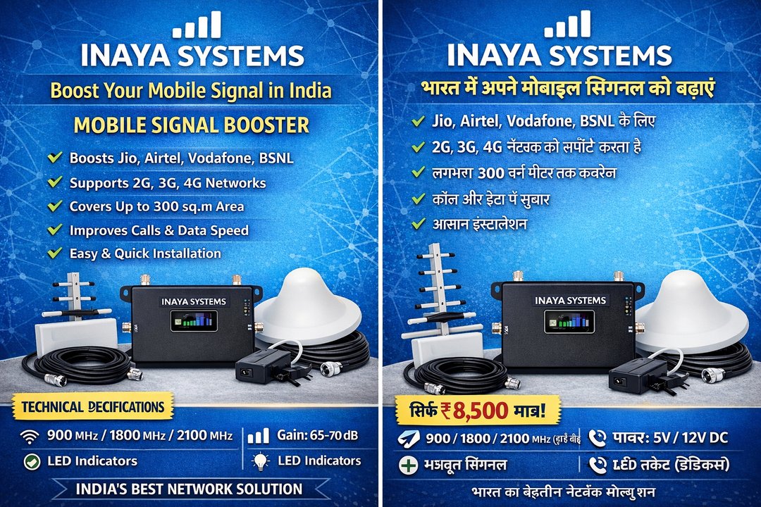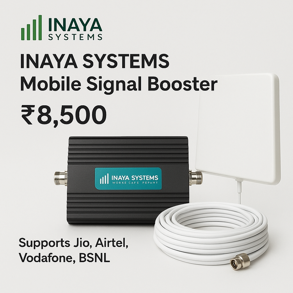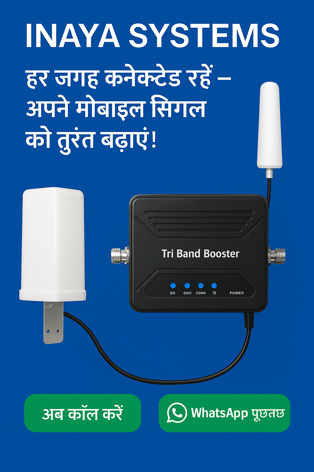 INAYA SYSTEMS Delhi NCR mein mobile signal booster ki sales, installation aur service dene wali ek trusted company hai. Hum 2G, 3G, 4G aur 5G network booster provide karte hain jo Jio, Airtel, Vodafone Idea aur BSNL networks ko support karte hain. Hum ghar, office, shop, basement, factory aur commercial buildings ke liye high-quality mobile network booster system install karte hain, jisse weak signal ki problem permanently solve hoti hai. Hamari services: ✔ Mobile Signal Booster Sale ✔ Professional Installation ✔ Network Signal Improvement ✔ 5G Network Booster Setup ✔ Indoor & Outdoor Antenna Installation ✔ Repair & Maintenance Service Hum genuine products, affordable price aur fast service ke liye jaane jaate hain. Customer satisfaction ha